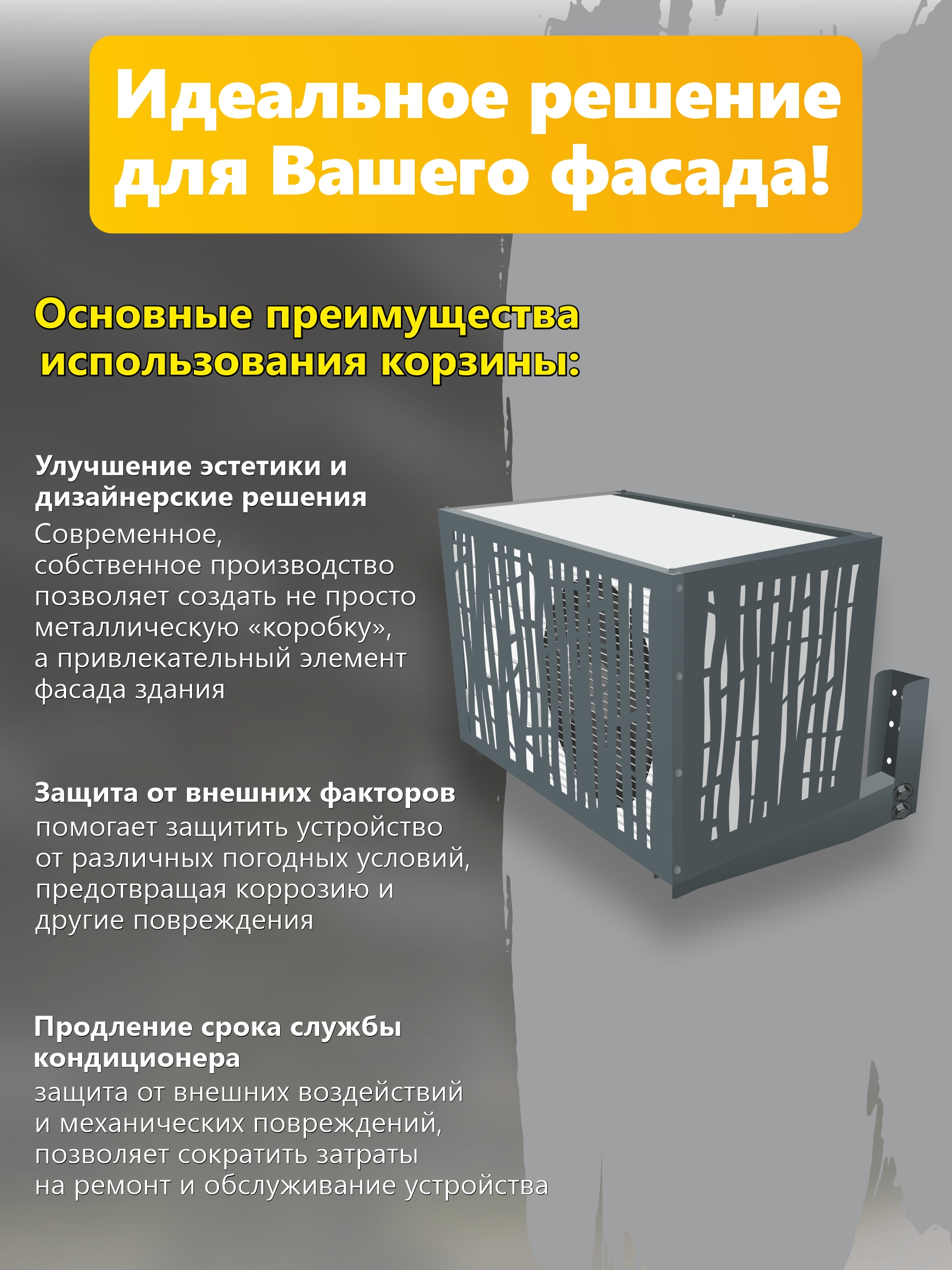 Компания Сигнал предлагает к продаже корзины для кондиционера в комплекте с кронштейном из двух частей, вы также можете выбрать другой вариант кронштейна на ваш выбор, в таком случае цена будет отличаться, уточняйте у менеджеров