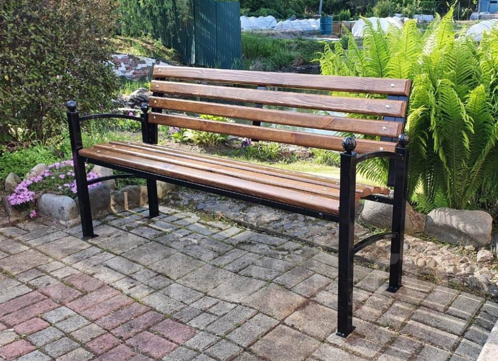 Скамейка с прочным металлическим каркасом предназначена для использования вне помещений. Качественная сварка обеспечит долговечность конструкции, а покрытие металла и дерева не пострадает от влаги, солнца, мороза. Конструкцию можно надёжно закрепить в грунте или поставить на твердое покрытие. Вес позволяет легко перемещать садовую скамейку. При этом места хватит для сидения двух-трёх человек. Строгий современный дизайн без вычурных изысков подойдёт к любому стилю дома и сада.